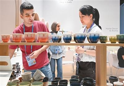 境外采购商(左)在第139届广交会第二期日用瓷器展台洽谈。新华社记者 邓华摄